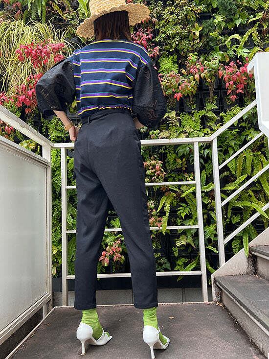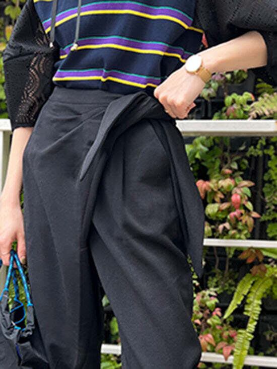 ウエストはベルトで調整でき、前で結ぶとアクセントに○