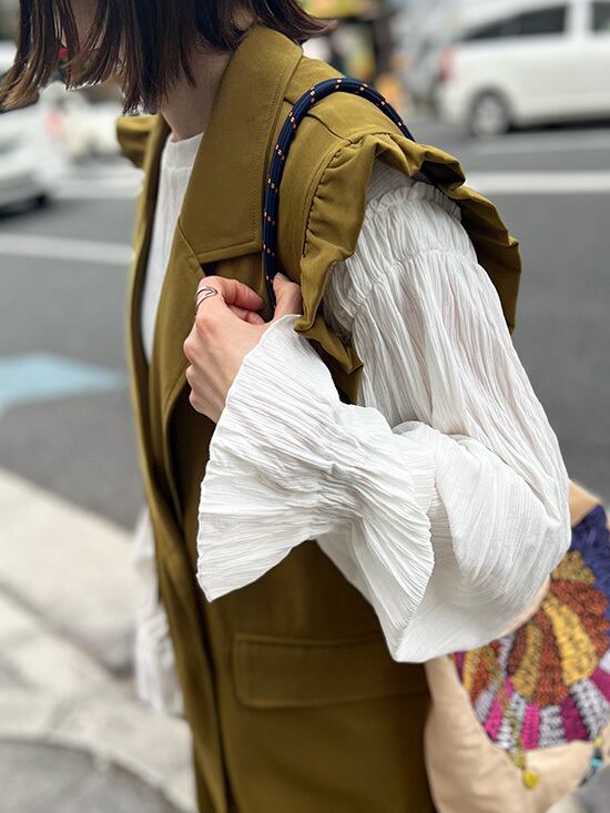 q.b.cオリジナル商品 大人気のクリンクルシリーズがデザイン袖になって登場 1枚で着るにももちろん!ベストなどのインナーにも使える万能アイテム。